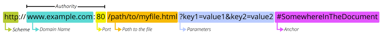 http 는 프로토콜 / / www.example.com 도메인 명 //:80 은 포트 // /path/to/myfile.html 은 리소스 경로 / key 는 파라미터 를 가리킨다.